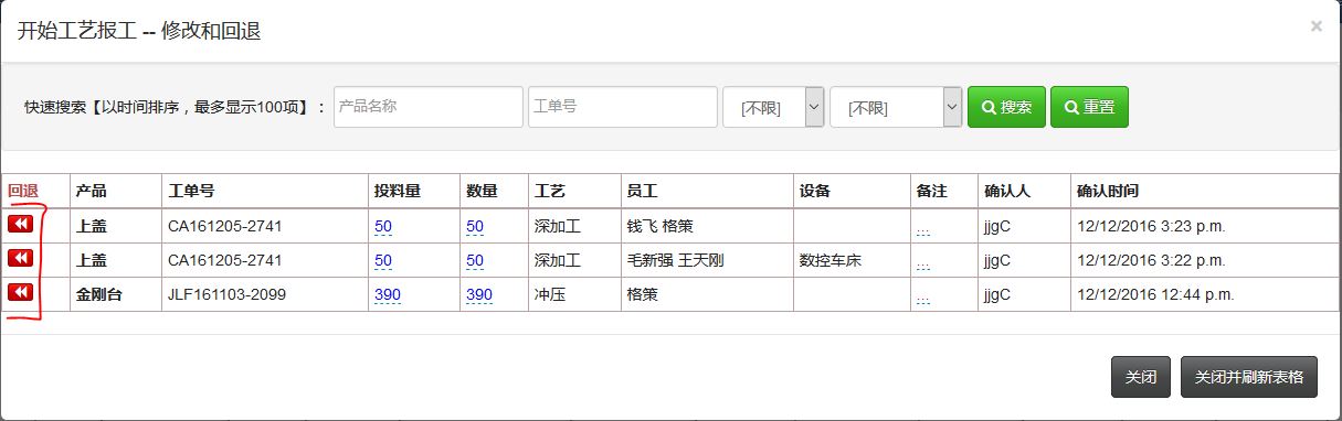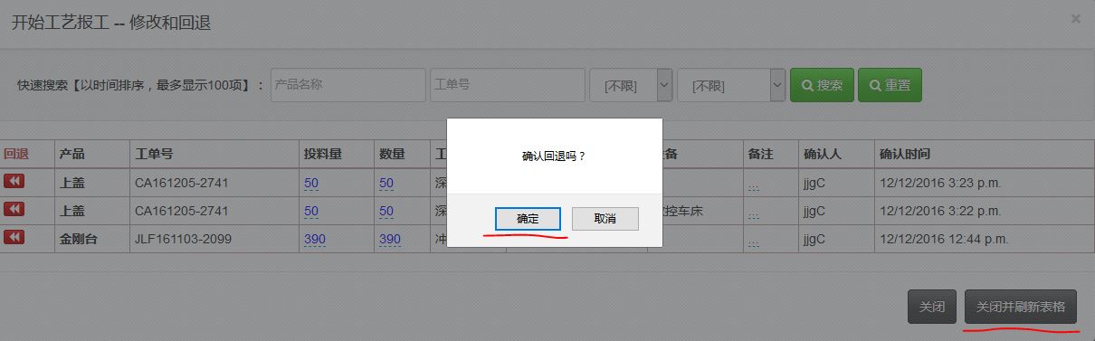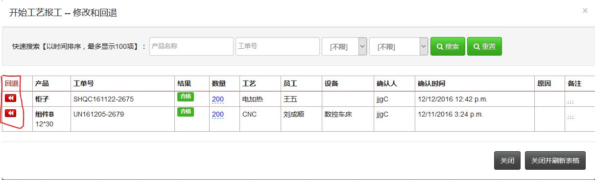 您的位置:首頁 > 培訓教程 > ERP/MES軟件基礎 速易天工MES系統之報工操作出錯怎么辦? 來源:通商軟件2016-12-142016-12-13 ERP系統 & MES 生產管理系統 10萬用戶實施案例,ERP 系統實現微信、銷售、庫存、生產、財務、人資、辦公等一體化管理 立即注冊免費體驗 在使用速易天工MES系统的过程中难免会有误操作,一旦出现操作错了,怎么办呢? 情况一:报工时出现错误 开始工艺出错 如果开始工艺的操作出错,那么就点击菜单开始工艺后点击开始报工记录-修改和回退,如下图 点击后会出来下面的对话框,红色箭头按钮代表回退,找到需要回退的信息点击 点击后会出现确认,点击确认后,再点击关闭并刷新表格就回退成功了,如下图 结束工艺出错 如果是结束工艺时出错了,那么就点击结束工艺,再点击结束报工记录-修改回退,如下图 点击后会出来下面的对话框,红色箭头按钮代表回退,找到需要回退的信息点击 点击后会出现确认,点击确认后,再点击关闭并刷新表格就回退成功了,如下图 在線疑問仍未解決?專業顧問為您一對一講解 24小時人工在線已服務6865位顧客5分鐘內回復 馬上咨詢
